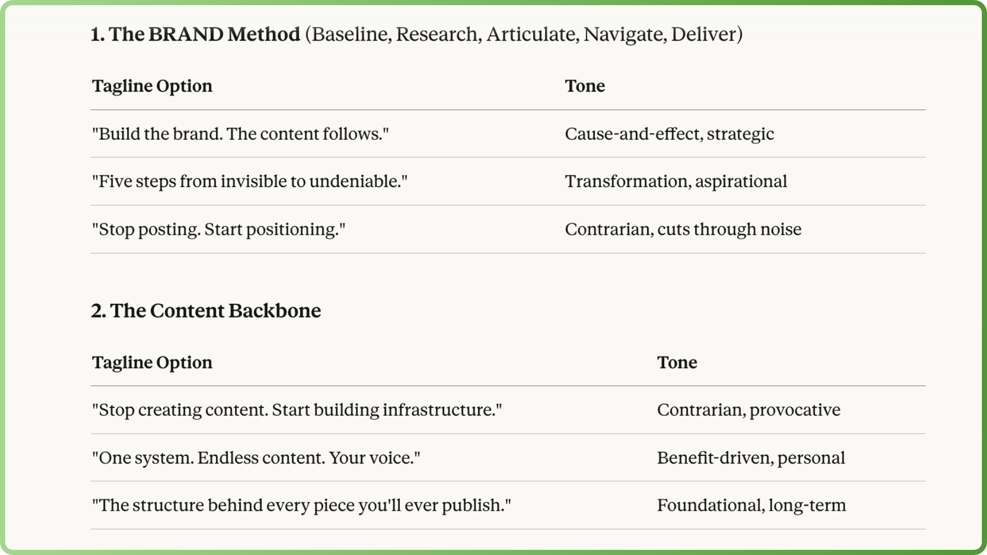Also provide 3 tagline options for the top 3 names.The “clear over clever” test: If your acronym feels forced, abandon it. It’s always better to be clear than clever.