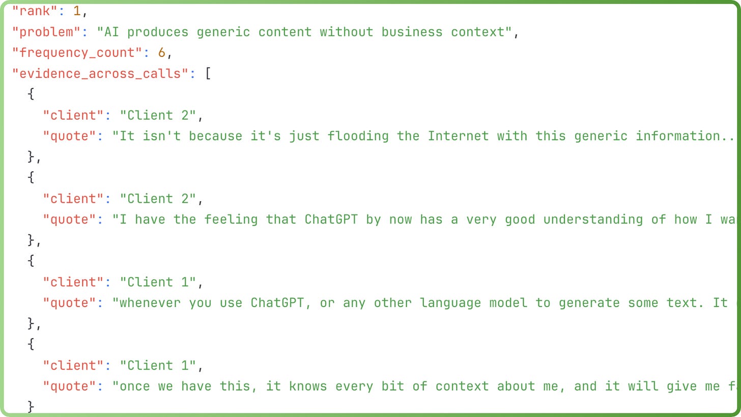 Now we’ll combine the outputs and look for what repeats. Finding patterns across multiple documents is tedious for humans and trivial for AI.